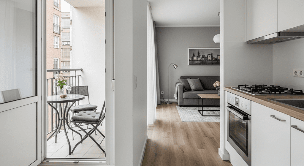 This layout works best in mild climates where doors can be open much of the year, or for those who prioritize outdoor living. The integrated approach treats the balcony as an actual room extension rather than a separate outdoor space.