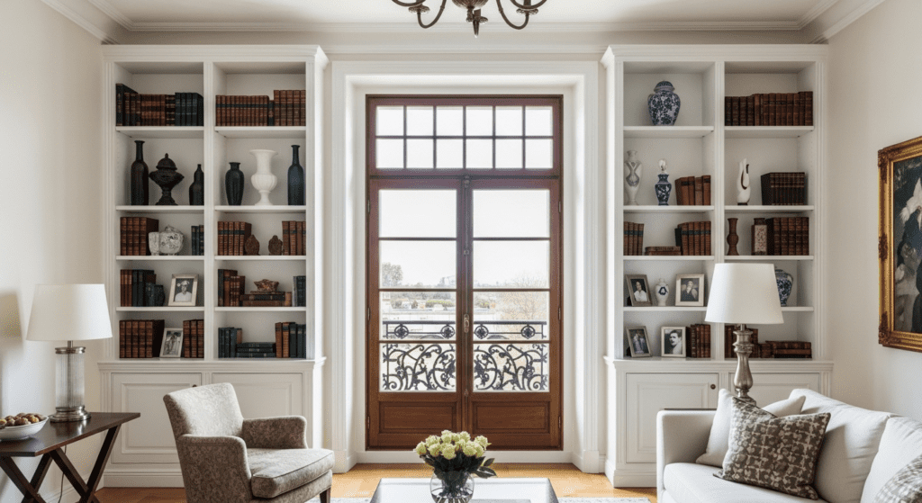 If your balcony doors are centered on a wall, position matching elements on either side—tall bookcases, console tables, or floor plants in matching planters. Arrange seating perpendicular to the doors, creating a U-shape that frames the balcony. The symmetrical flanking draws attention to the balcony while providing functional storage or display space.