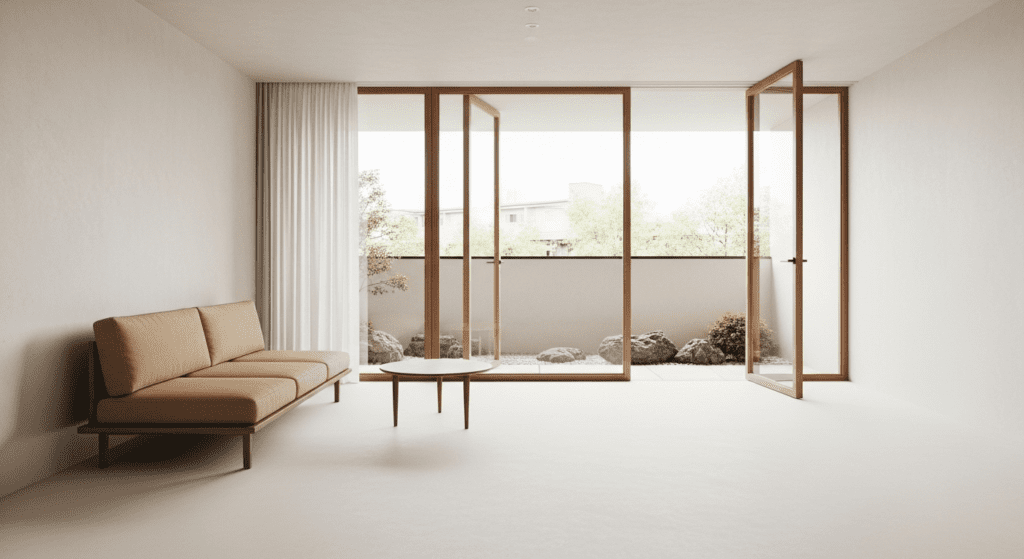Keep the area within 6 feet of the balcony doors completely clear of furniture, creating an open threshold that blurs the boundary between inside and outside. When balcony doors are open, the spaces merge seamlessly. Use light colors and simple lines throughout to maintain the airy, uncluttered aesthetic.