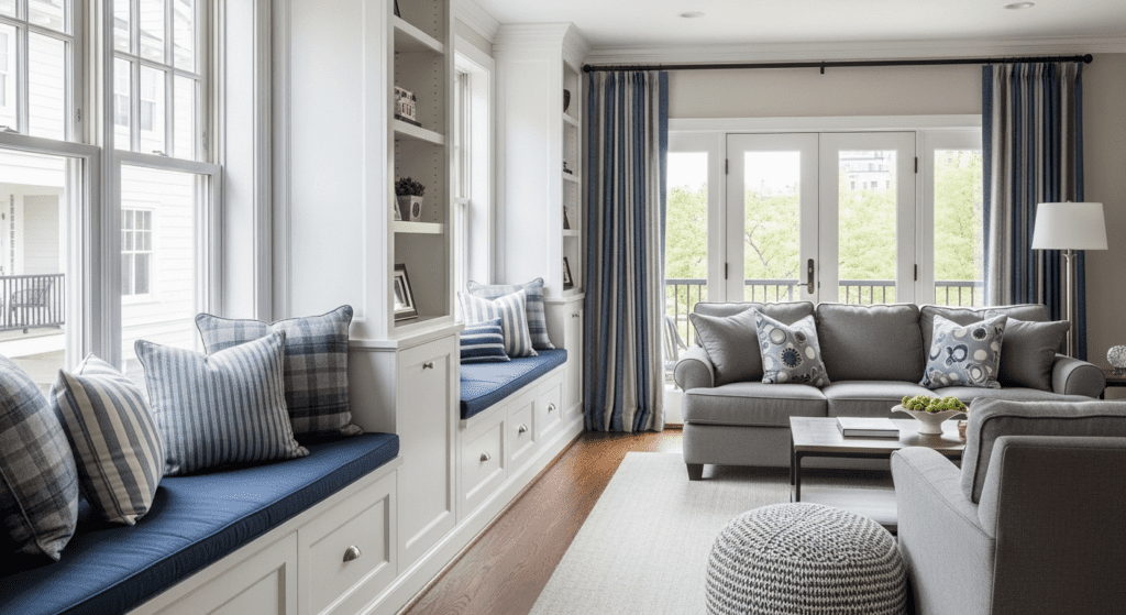 This layout adds character and functionality while making smart use of the valuable space near the balcony. The built-in nature of the window seat means it doesn’t visually clutter the room the way freestanding furniture might.