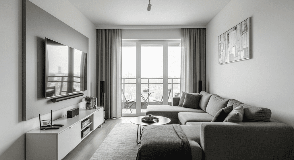 Mount your TV on a wall away from the balcony—either on one of the long walls or the short wall opposite the balcony. Arrange seating to face the TV, creating a traditional entertainment-focused layout. This arrangement allows you to watch TV without glare from the balcony doors while maintaining clear access to the outdoor space.