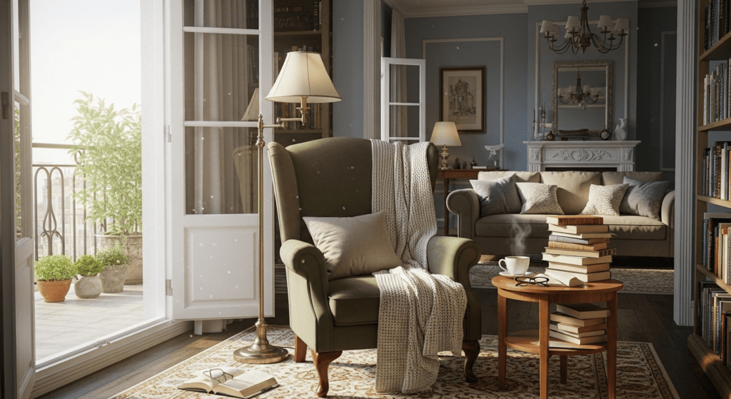 This layout works beautifully for book lovers or anyone who wants a dedicated peaceful spot that celebrates the balcony. The reading nook can easily overflow onto the balcony during pleasant weather, extending your reading space outdoors.