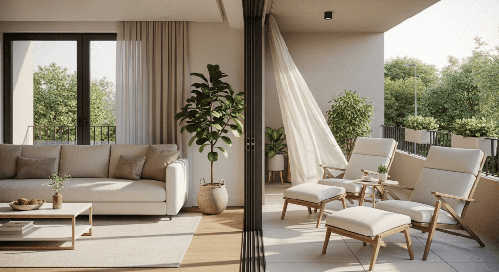 Coordinate your indoor furniture style with outdoor balcony furniture, using similar colors, materials, or aesthetic so the spaces feel like one cohesive design. When doors are open, the living room and balcony function as one large space. Position seating to take advantage of cross-ventilation and fresh air flow.