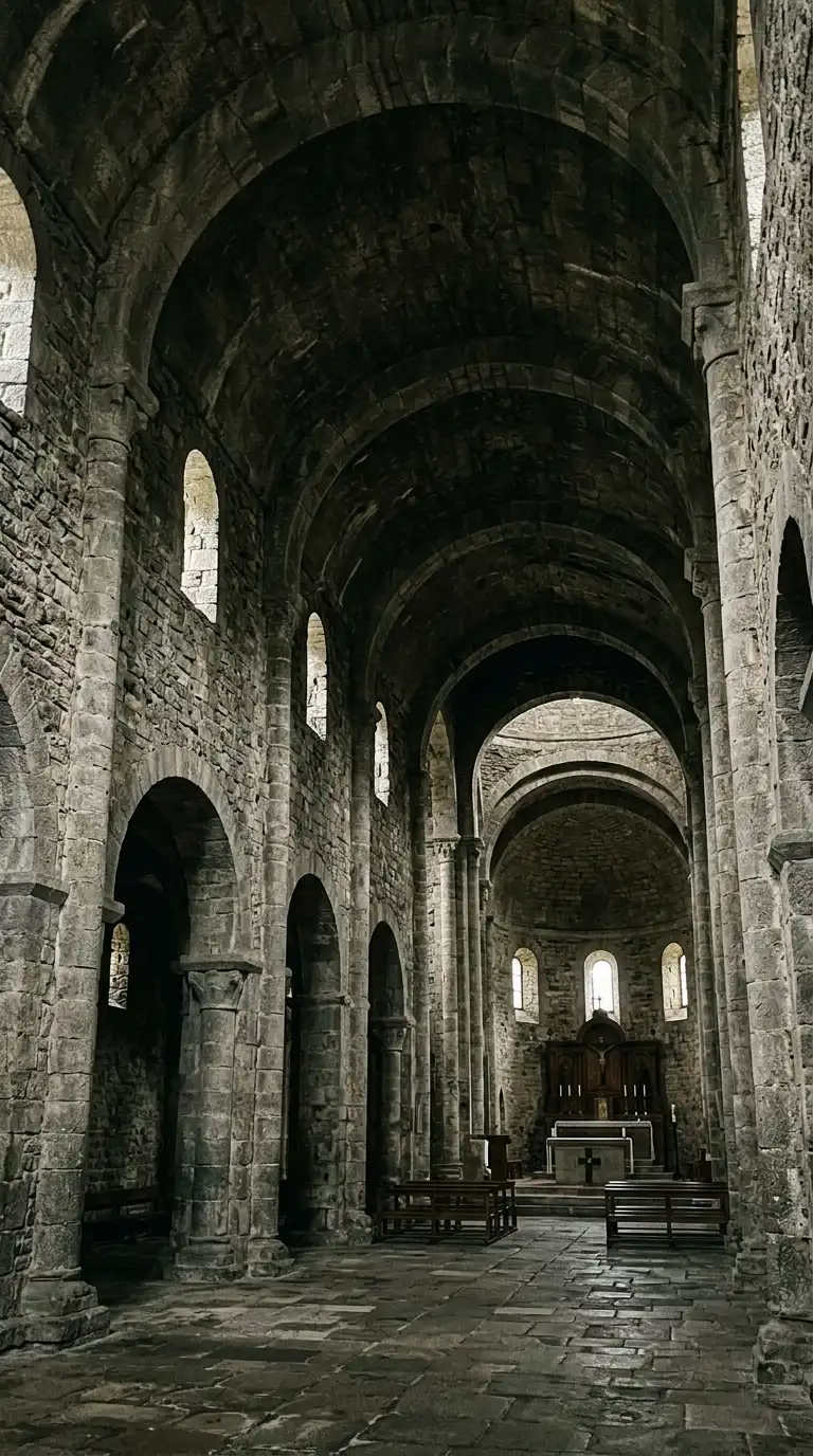 The Romanesque church has thick stone walls, small windows, and round arches. The interior is dark and heavy. The vault is a stone barrel vault. The Romanesque church is fortress-like, solid, and dark.