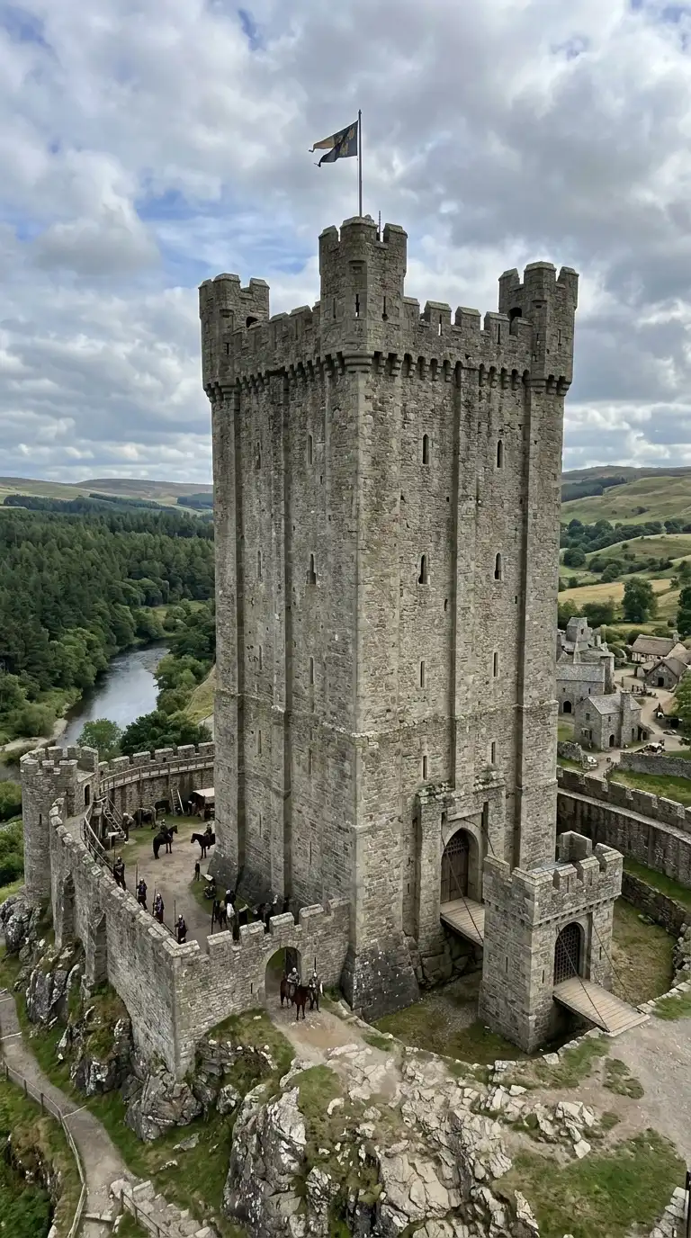 The castle is a fortified residence for a lord or king. The castle has high stone walls, corner towers, a gatehouse, and a moat. The walls are crenellated for defence. The castle is defensive, vertical, and powerful.