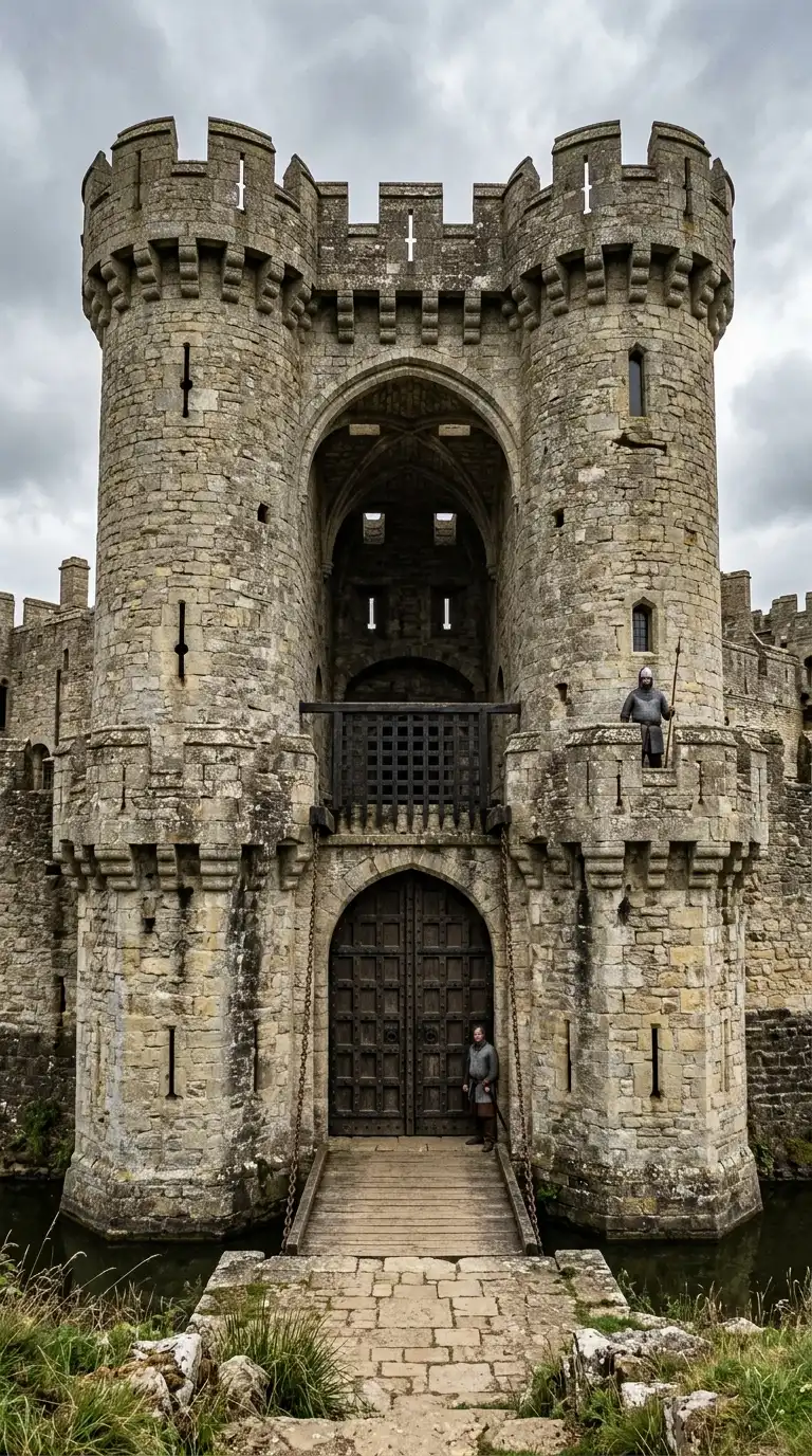The gatehouse is the entrance to a castle. It has a gate, a portcullis, murder holes, and flanking towers. The gatehouse is the most heavily defended part of the castle. The gatehouse is defensive, fortified, and imposing.
