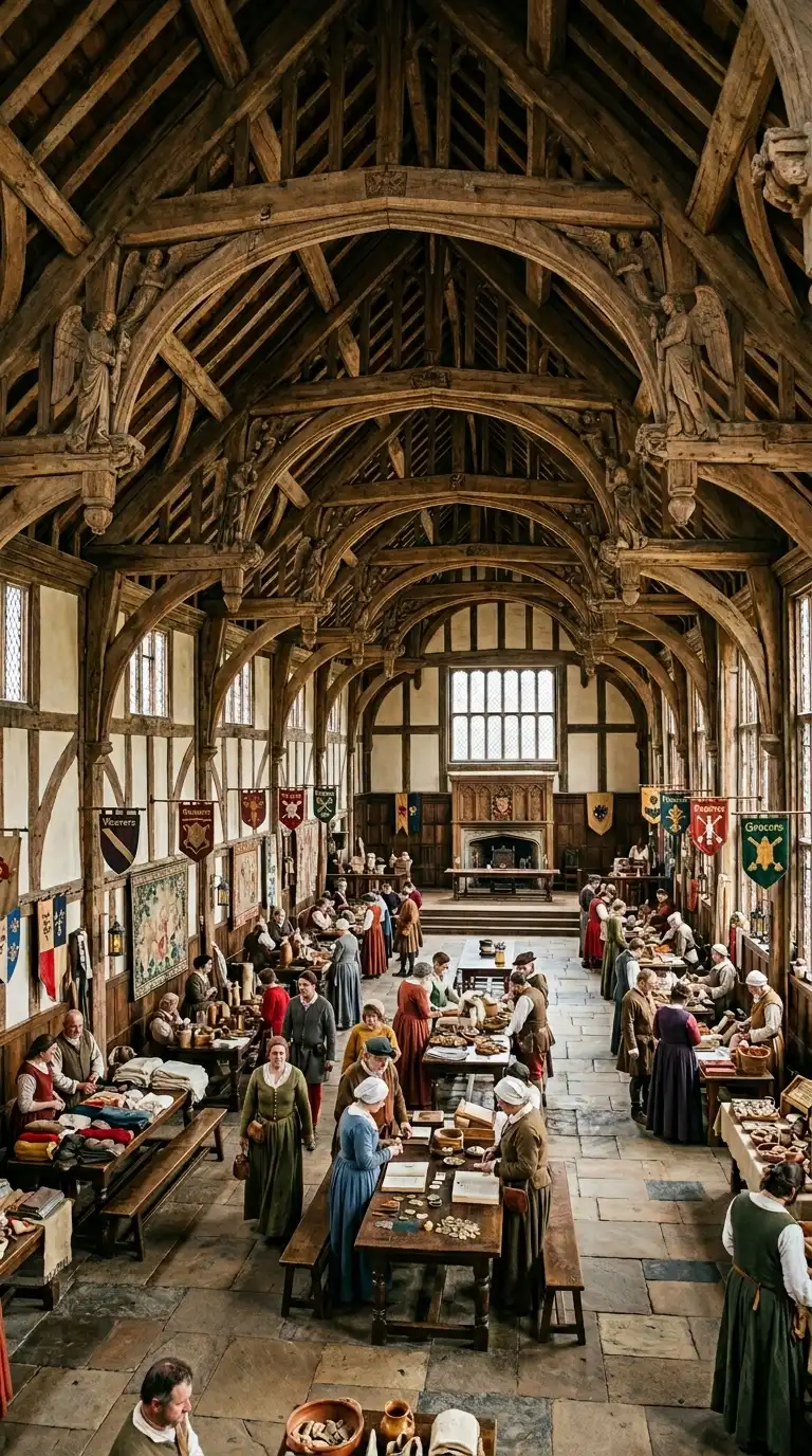 The guildhall is a timber-framed hall for trade guilds. The hall is large and open. The roof is a hammerbeam roof. The guildhall is commercial, civic, and timber.