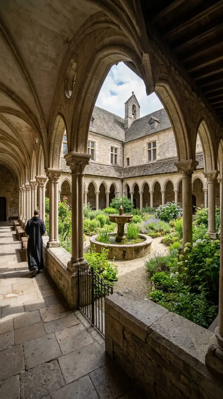 The cloister is a covered walkway around a courtyard in a monastery. The walkway has an arcade of arches. The courtyard has a garden and a fountain. The cloister is calm, sheltered, and monastic.