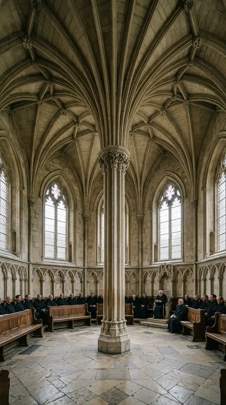 The chapter house is a meeting room for monks or canons. The chapter house is often polygonal or circular, with a central column and a vaulted ceiling. Benches line the walls. The chapter house is communal, vaulted, and monastic.