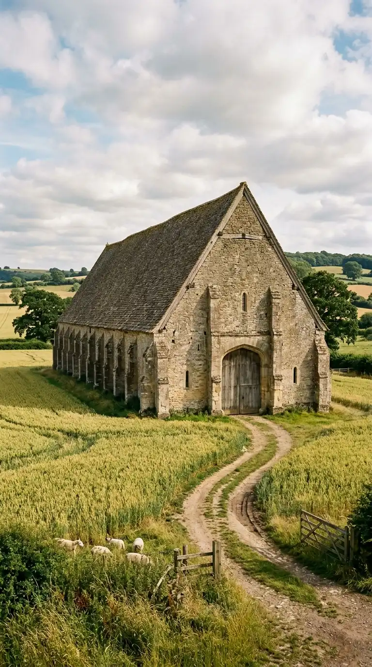 The tithe barn is a large stone barn for storing agricultural produce. The barn is long and tall. The roof is high and steep. The tithe barn is agricultural, monumental, and stone.