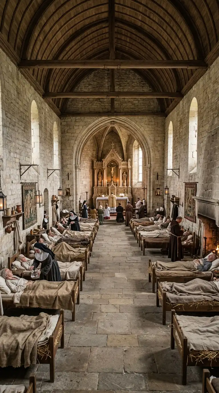 The medieval hospital was not a medical hospital. It was a hostel for pilgrims and the poor. The hospital was a long hall with a high roof. Beds lined the walls. An altar was at one end. The medieval hospital was charitable, communal, and hall-like.