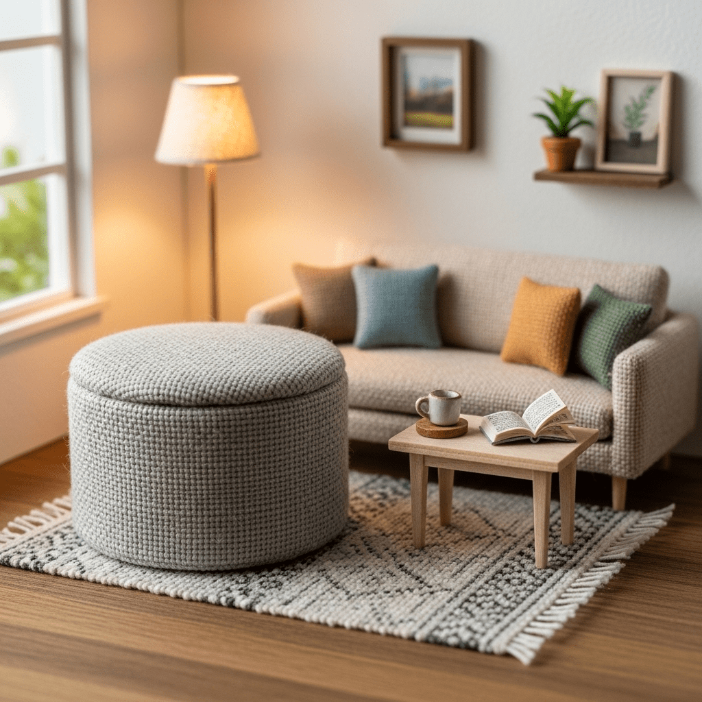 Use an upholstered storage ottoman as your coffee table. It provides a soft surface for feet, extra seating for guests, and a hidden spot to store bulky blankets or pillows.