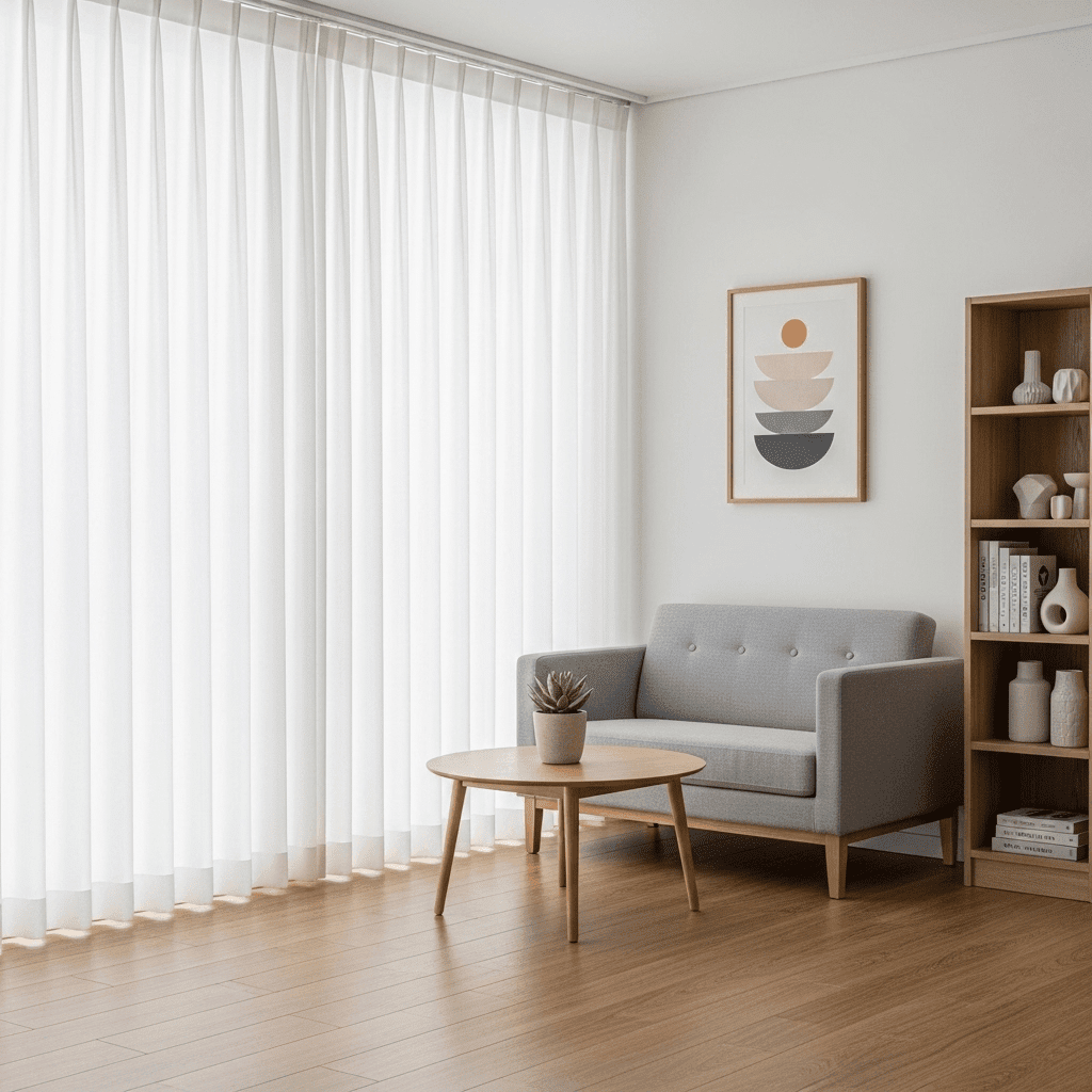 Hang white sheer curtains from the very top of the wall. The continuous vertical lines make the walls feel taller while softening the light for a breezy, open feel.