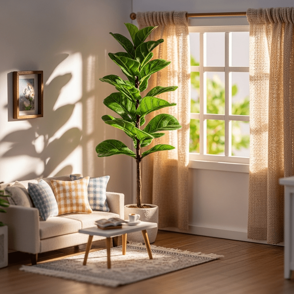 Instead of several small plants, choose one tall, slender tree. The verticality adds a sense of “nature’s architecture” and draws the eye toward the ceiling.