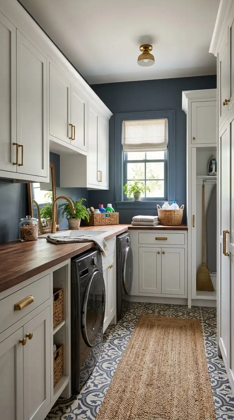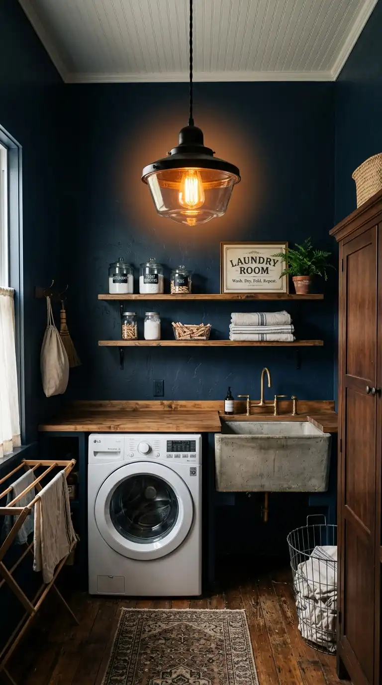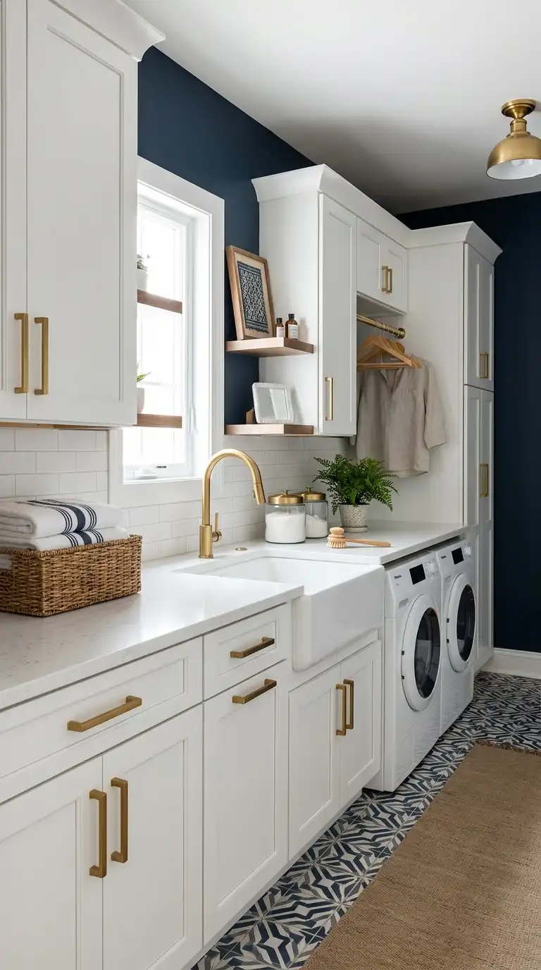 Navy blue walls create a dramatic, cocooning effect in a laundry room. The deep color absorbs light and makes the space feel intimate and sophisticated. Pair navy walls with white cabinets and countertops for high contrast, or use wood tones for a warmer feel. Brass hardware adds warmth and elegance. Navy works especially well in larger laundry rooms with good natural or artificial lighting.
