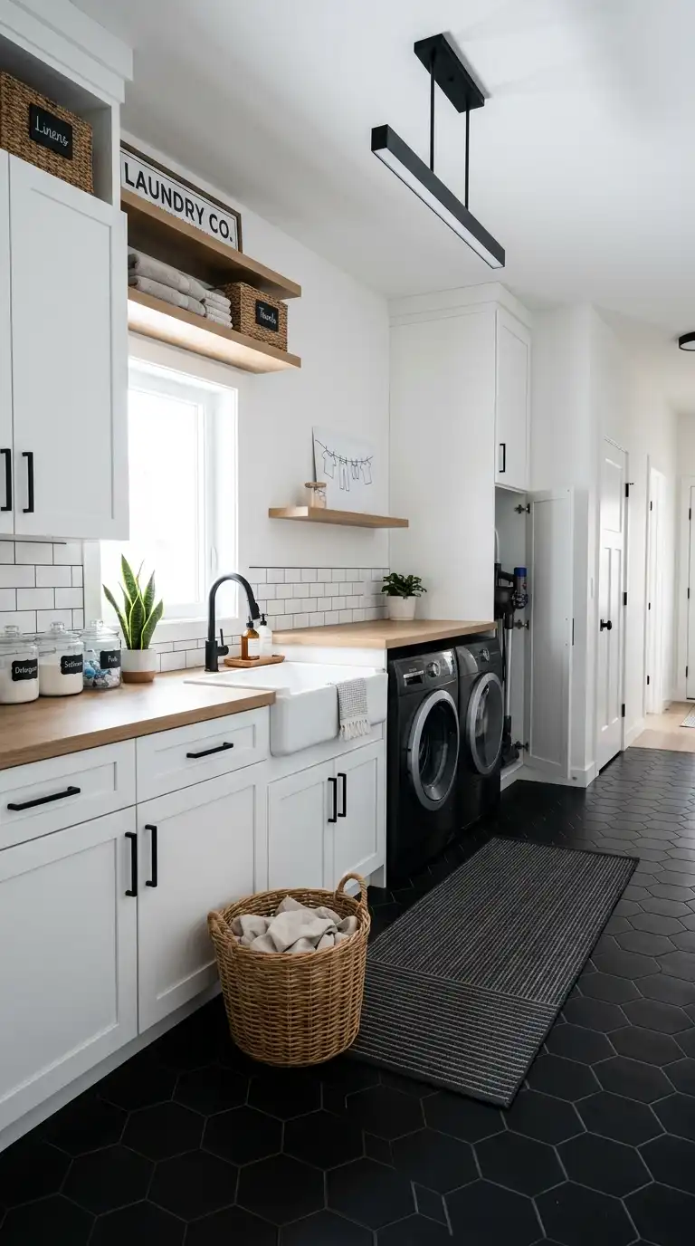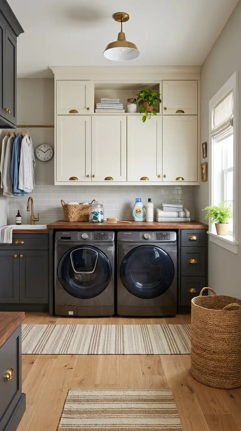 Paint your lower cabinets charcoal gray and keep upper cabinets white or cream for a balanced, moody look. Charcoal gray is deep but not as intense as black, making it a versatile choice for moody laundry rooms. Pair with butcher block countertops, brass hardware, and warm lighting. The dark cabinets anchor the room while the light uppers keep it from feeling too cave-like.