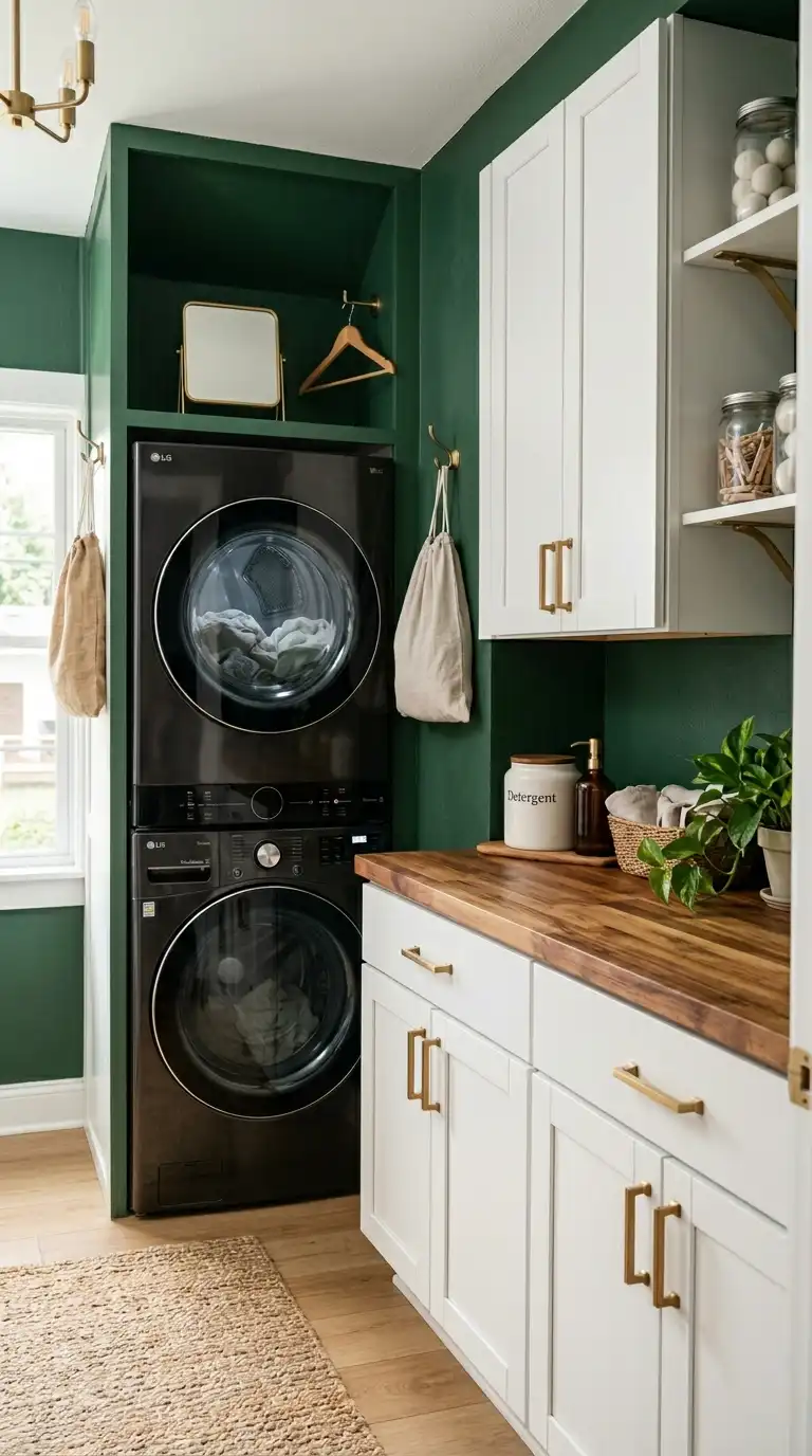 Forest green is a deep, rich green that feels moody and organic. Paint a single wall behind your washer and dryer in forest green to create a focal point without overwhelming the room. Keep the other walls light or white. Pair with wood tones, brass hardware, and plenty of plants to enhance the earthy feel.