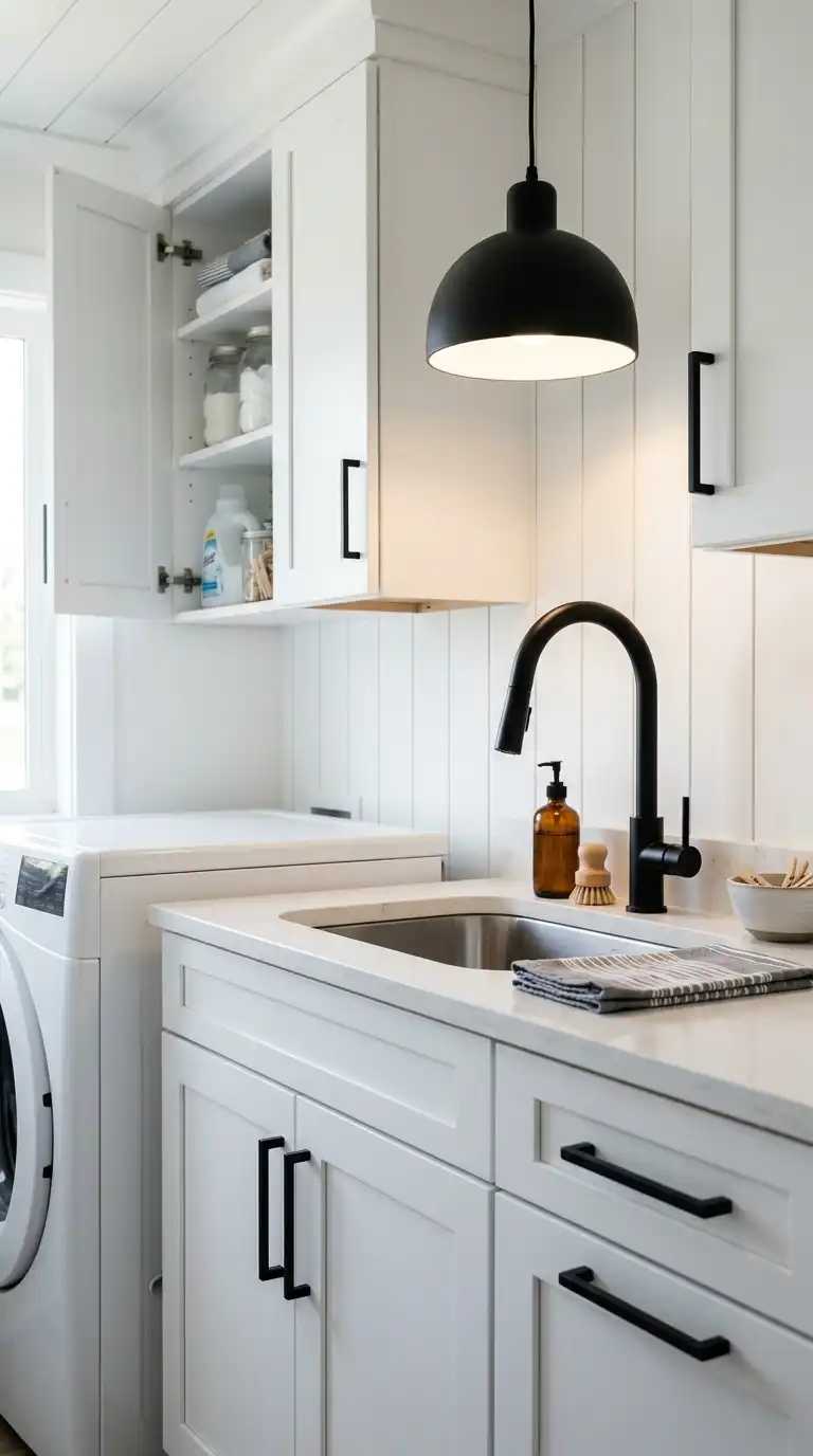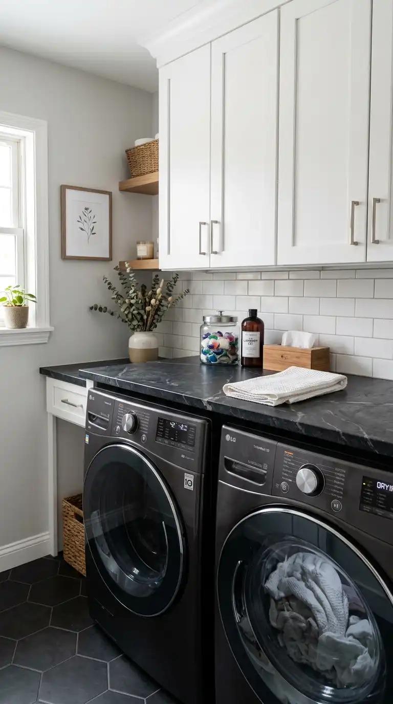 Swap light countertops for dark granite, soapstone, or black quartz. Dark countertops add weight and drama to the room. Pair with light cabinets for contrast, or go fully moody with dark cabinets as well. Dark countertops hide stains and wear better than light ones, making them practical for a laundry room.