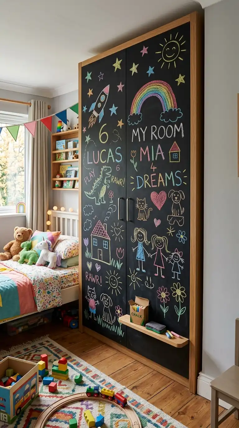 Paint wardrobe doors with chalkboard paint to create an interactive surface, perfect for children’s rooms or creative spaces. Children can draw and write on the doors, and the surface can be wiped clean for endless creativity. Use a few coats of chalkboard paint for a durable finish.