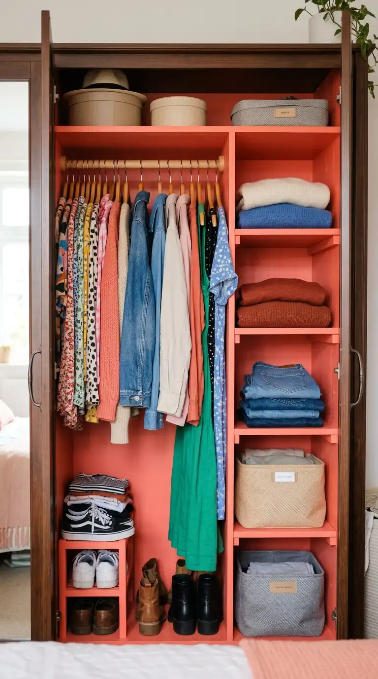 Don’t forget the inside of the wardrobe. Painting the interior in a contrasting or complementary color adds a surprise element and makes it easier to see items. A bright color like coral, yellow, or turquoise can bring joy to the daily task of getting dressed.