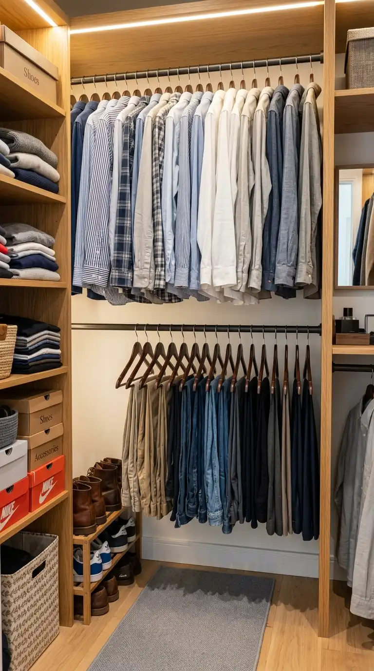 Use slim, space-saving hanging rods to maximize the number of garments you can store. Double hanging rods allow you to use vertical space efficiently—hang shirts and blouses on the top rod, and trousers or skirts below. Slim rods also help maintain a clean, organized appearance.