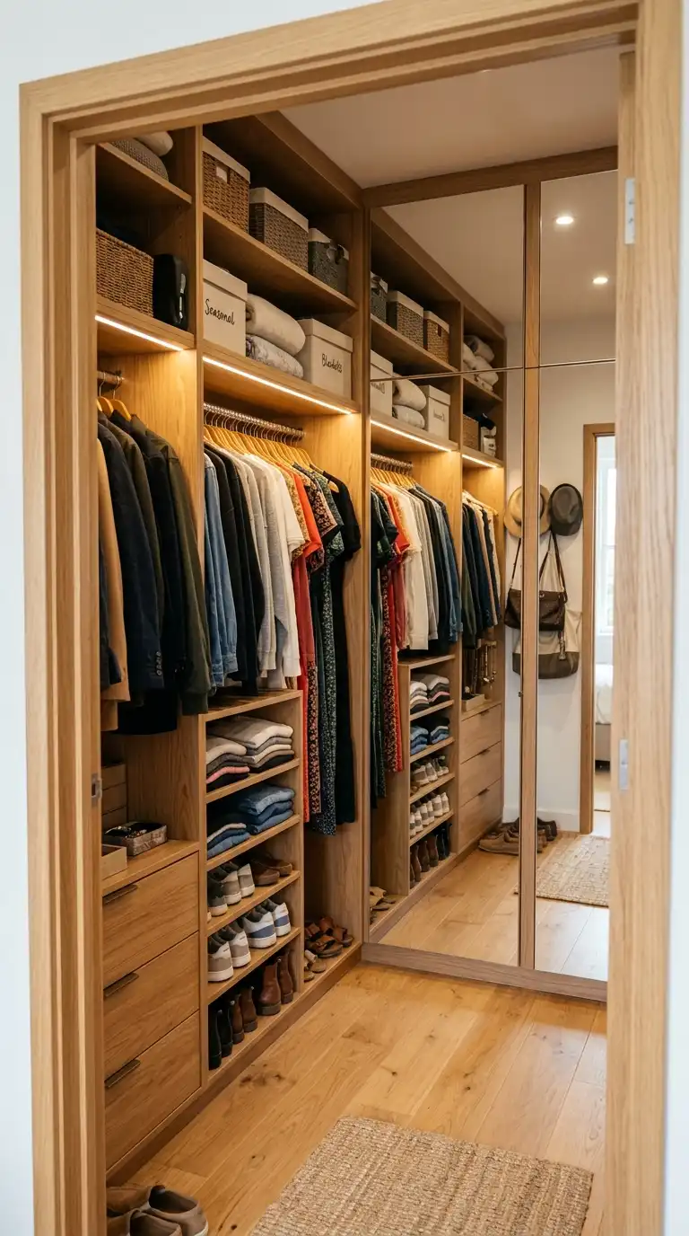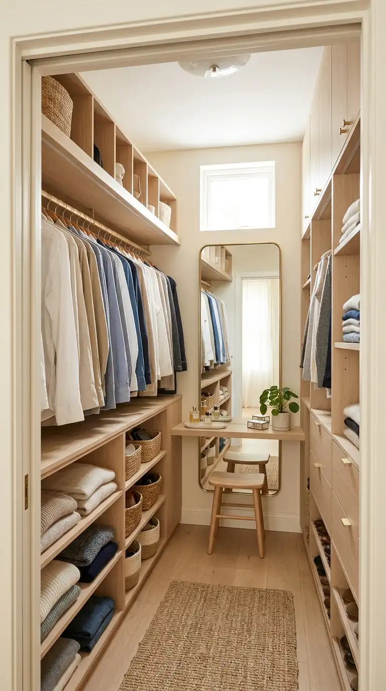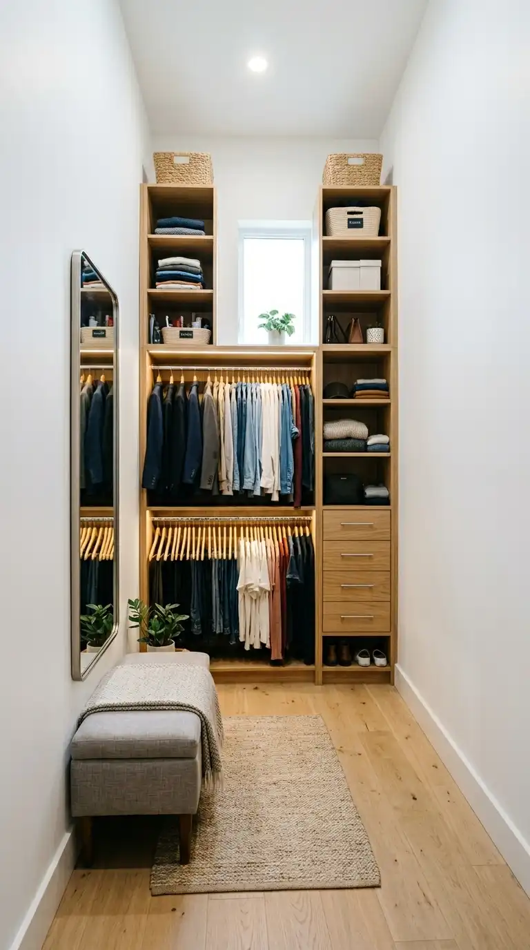 A single-sided layout along one wall is often most practical for narrow spaces. Use floor-to-ceiling storage to maximize vertical space. Add a full-length mirror on the opposite wall to create depth. - How do I organize a small walk-in wardrobe?