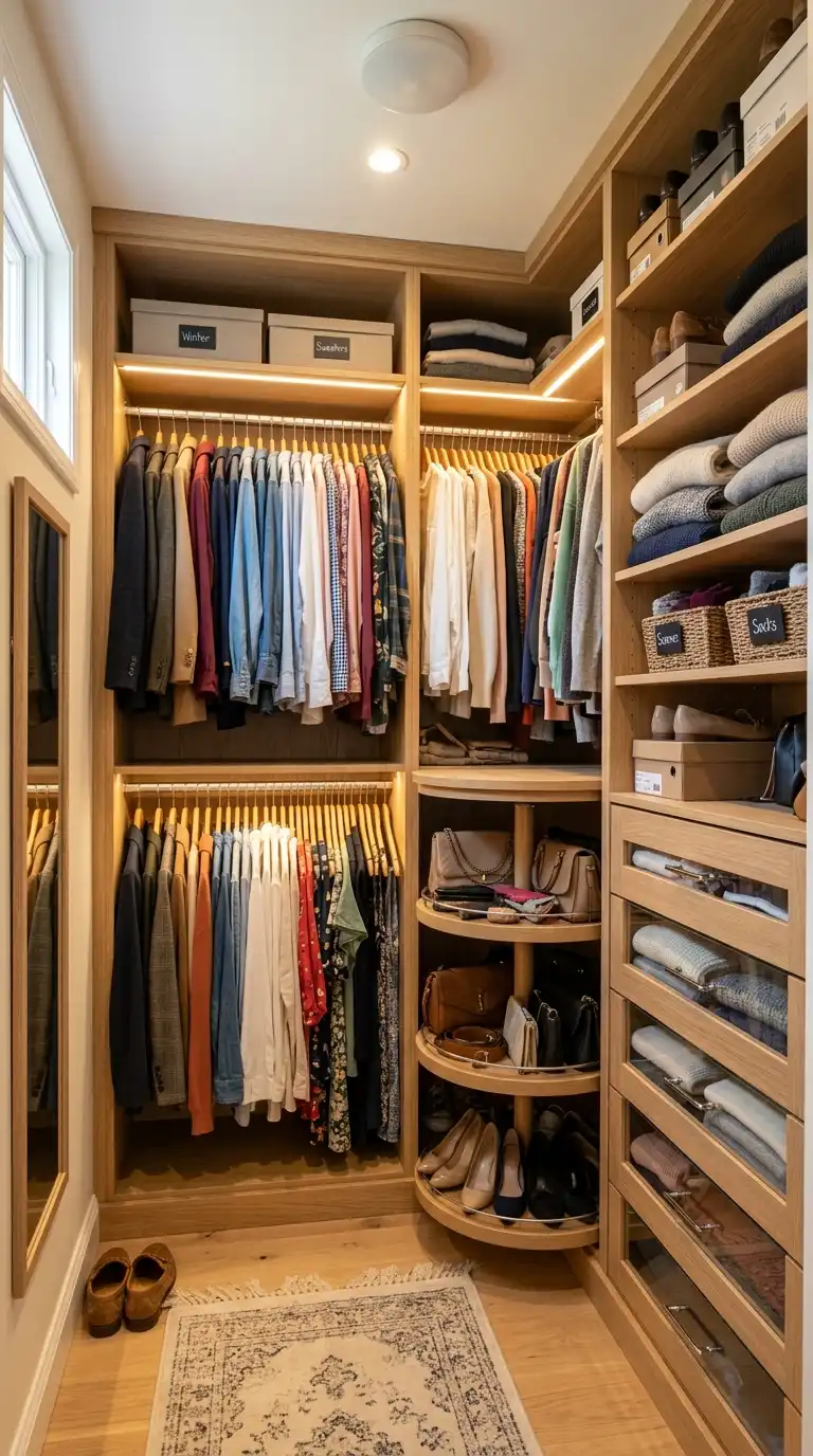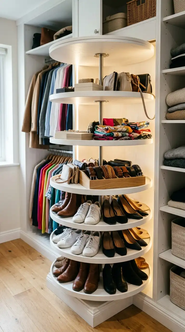 Maximize a tight corner with a rotating carousel or lazy Susan. These circular shelves make deep corner storage accessible, bringing items stored at the back to the front with a gentle turn. Carousels are ideal for shoes, folded clothing, or accessories. Install them in corner units to eliminate wasted space.