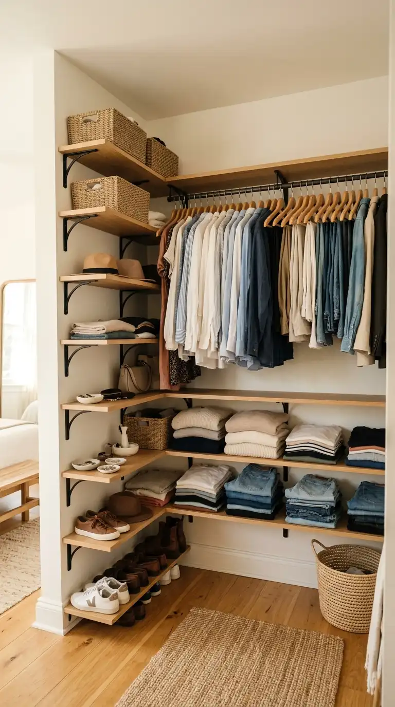 Remove cabinet doors to create an open shelving system that feels more spacious and accessible. Open shelving allows you to see everything at a glance and encourages organization. Use uniform hangers and matching storage boxes to maintain a polished look. This approach works especially well in small walk-ins where doors would feel bulky.