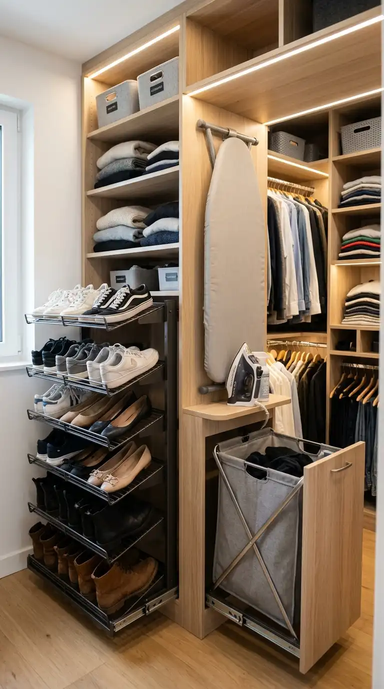 In a small space, every inch counts. Incorporate pull-out racks for shoes, fold-down ironing boards, and pull-out hampers to maximize functionality. These features allow you to store more in a compact footprint while keeping the wardrobe organized and accessible.