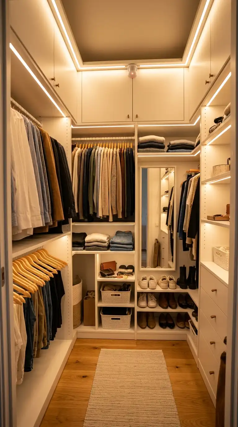 Good lighting is essential in a small walk-in wardrobe. Install LED strip lights along the top of cabinets, inside shelves, and under hanging rods to illuminate every corner. Motion sensors activate lights when you enter, adding convenience and a touch of luxury. Proper lighting also makes the space feel more open.