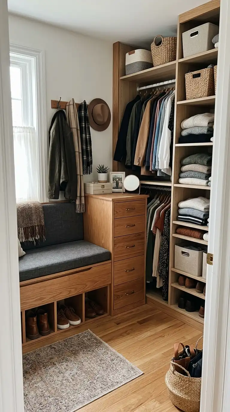 Choose furniture that serves multiple purposes in a small walk-in. A bench with hidden storage provides seating and a place for shoes. A narrow dresser can serve as both a surface for folding and storage for accessories. Look for pieces that maximize function without taking up extra space.