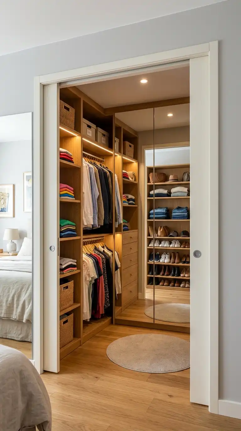 In a compact walk-in, swinging doors take up valuable floor space. Replace them with sliding doors or pocket doors that disappear into the wall. Sliding doors glide on a track, while pocket doors recess into the wall cavity, both providing full access without encroaching on the room. Choose mirrored doors to enhance the sense of space.