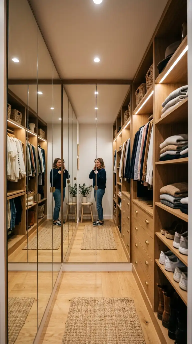 Cover one or more walls with mirrors to visually double the space in a small walk-in. Full-length mirrors are practical for outfit checks and reflect light, making the room feel larger and brighter. Use frameless mirrors for a seamless look, or incorporate mirrored panels into cabinetry doors.