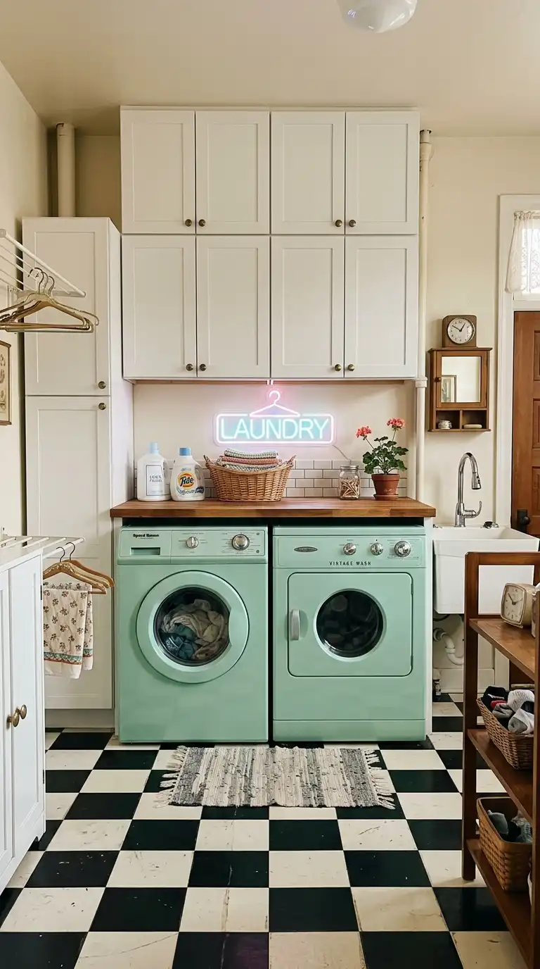 Make your washer and dryer the stars of the room with retro pastel appliances. Look for machines in mint green, pale pink, butter yellow, or baby blue. If new retro appliances are out of budget, paint your existing machines with appliance epoxy in a pastel shade. The soft colors immediately create a vintage 1950s vibe.