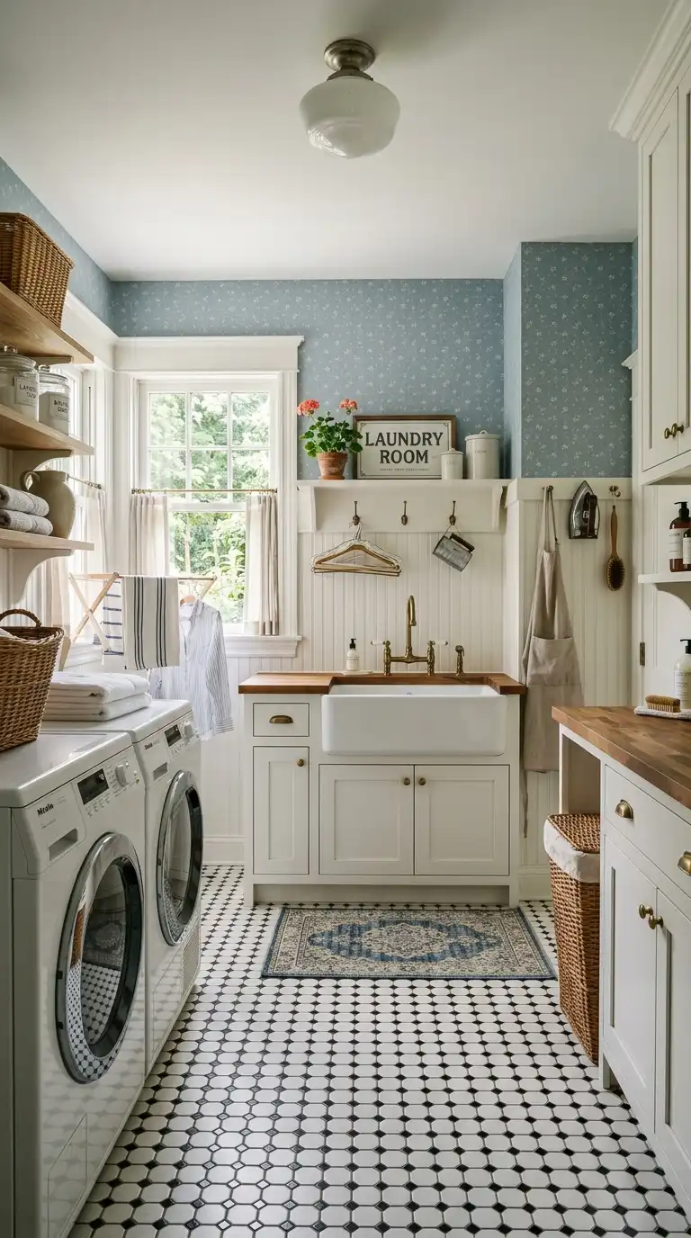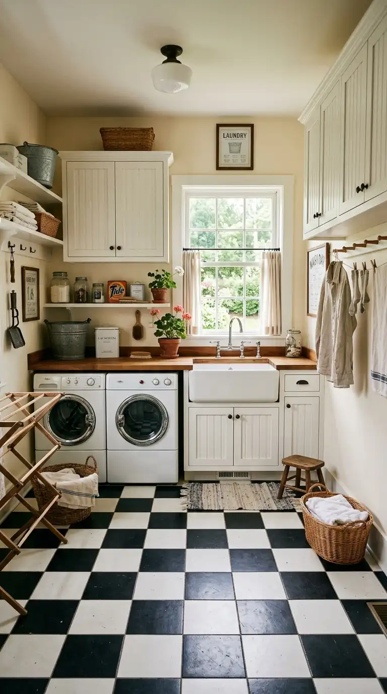 A vintage laundry room evokes nostalgia, charm, and a sense of simpler times. From retro appliances and checkerboard floors to enamel signs and glass jars, vintage design transforms a utilitarian space into a warm, inviting room. Whether you love the 1950s diner aesthetic, farmhouse charm, or old-world European style, there is a vintage look for you. Here are thirteen vintage laundry room designs to inspire your next project.