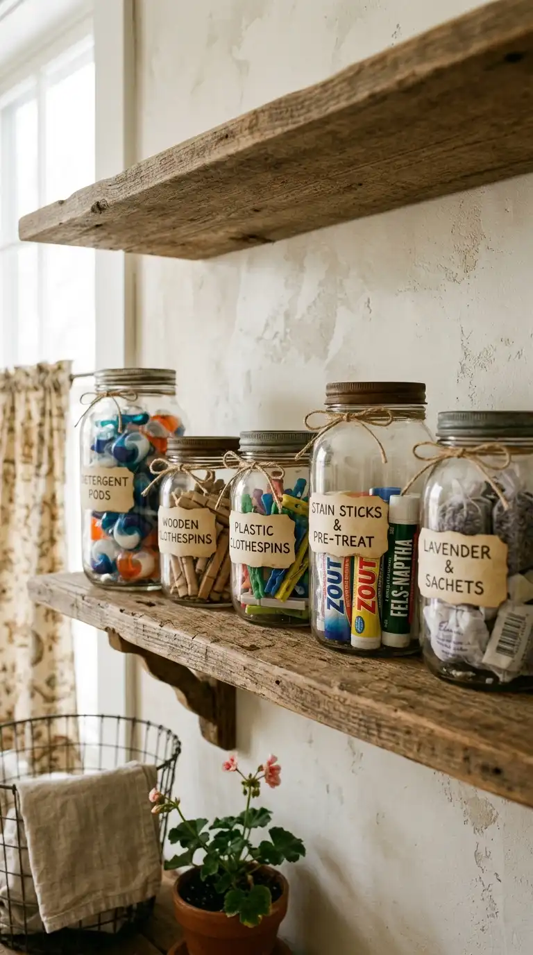 Store laundry supplies in glass jars on open shelves for a vintage apothecary look. Use jars of varying sizes for detergent pods, clothespins, stain sticks, and wool dryer balls. Label each jar with a handwritten tag or chalkboard label. The glass jars keep supplies visible and add old-fashioned charm.