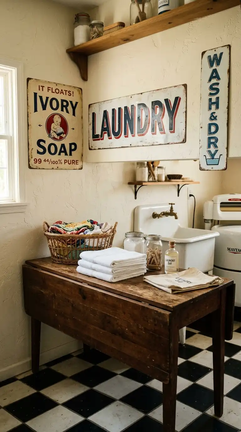 Decorate your walls with vintage enamel signs. Look for signs advertising laundry products like “Ivory Soap,” “Oxydol,” or “Rinso.” Also look for general vintage signs like “Laundry,” “Wash & Dry,” or “Soap.” The bright colors and bold typography add instant nostalgia.