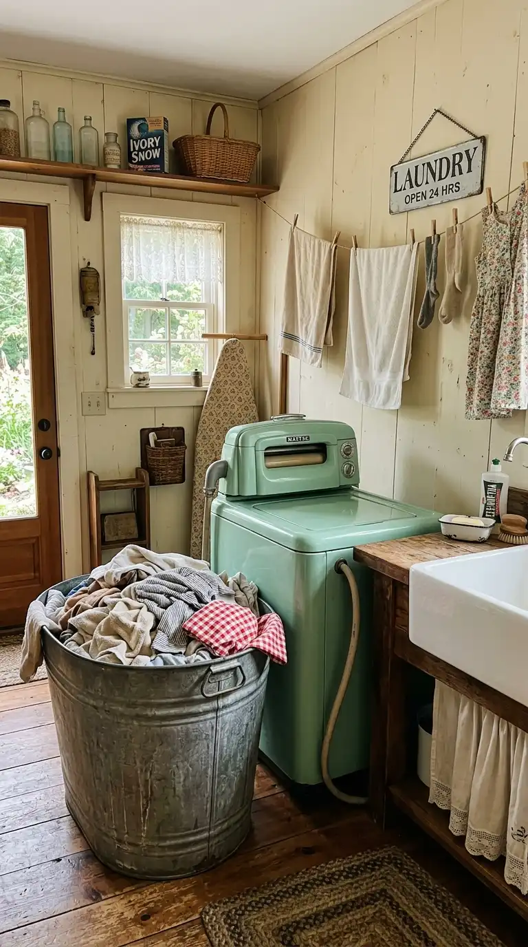 Use metal wire baskets for storing clothespins, dryer sheets, and small supplies. The industrial look of wire baskets fits perfectly with vintage laundry rooms. Look for baskets with a white or galvanized finish. Stack them on open shelves or hang them on hooks.