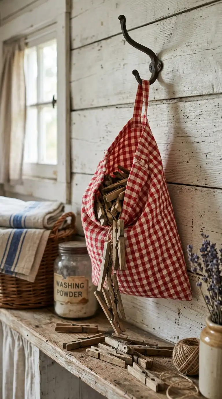 Hang a vintage-style clothespin bag from a hook or clothesline. Look for a bag made of cotton with a metal hanger, or sew your own from retro fabric. Fill the bag with wooden clothespins. The bag is both functional and decorative.