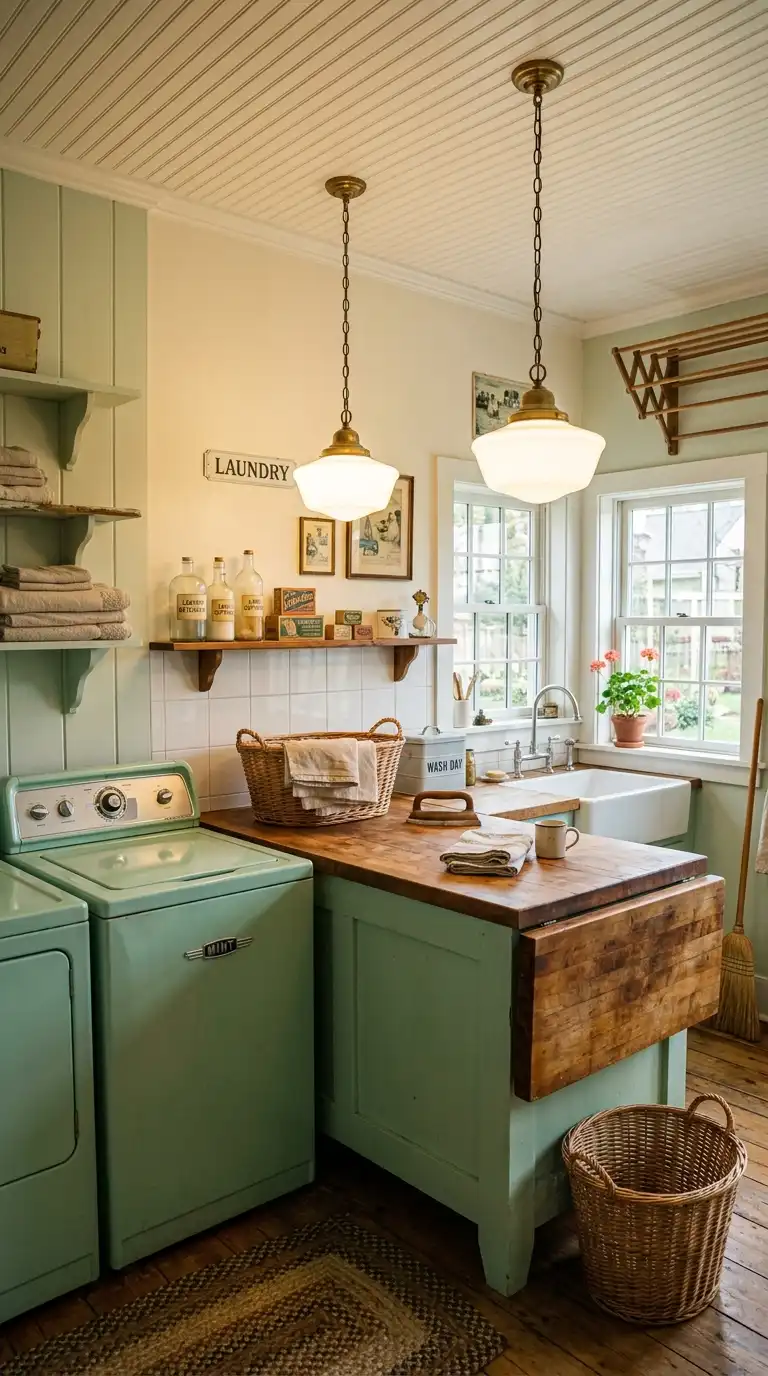 Install schoolhouse pendant lights or gooseneck lamps for authentic vintage lighting. The simple, utilitarian design fits perfectly in a vintage laundry room. Use bulbs with a warm color temperature to create a soft, nostalgic glow.