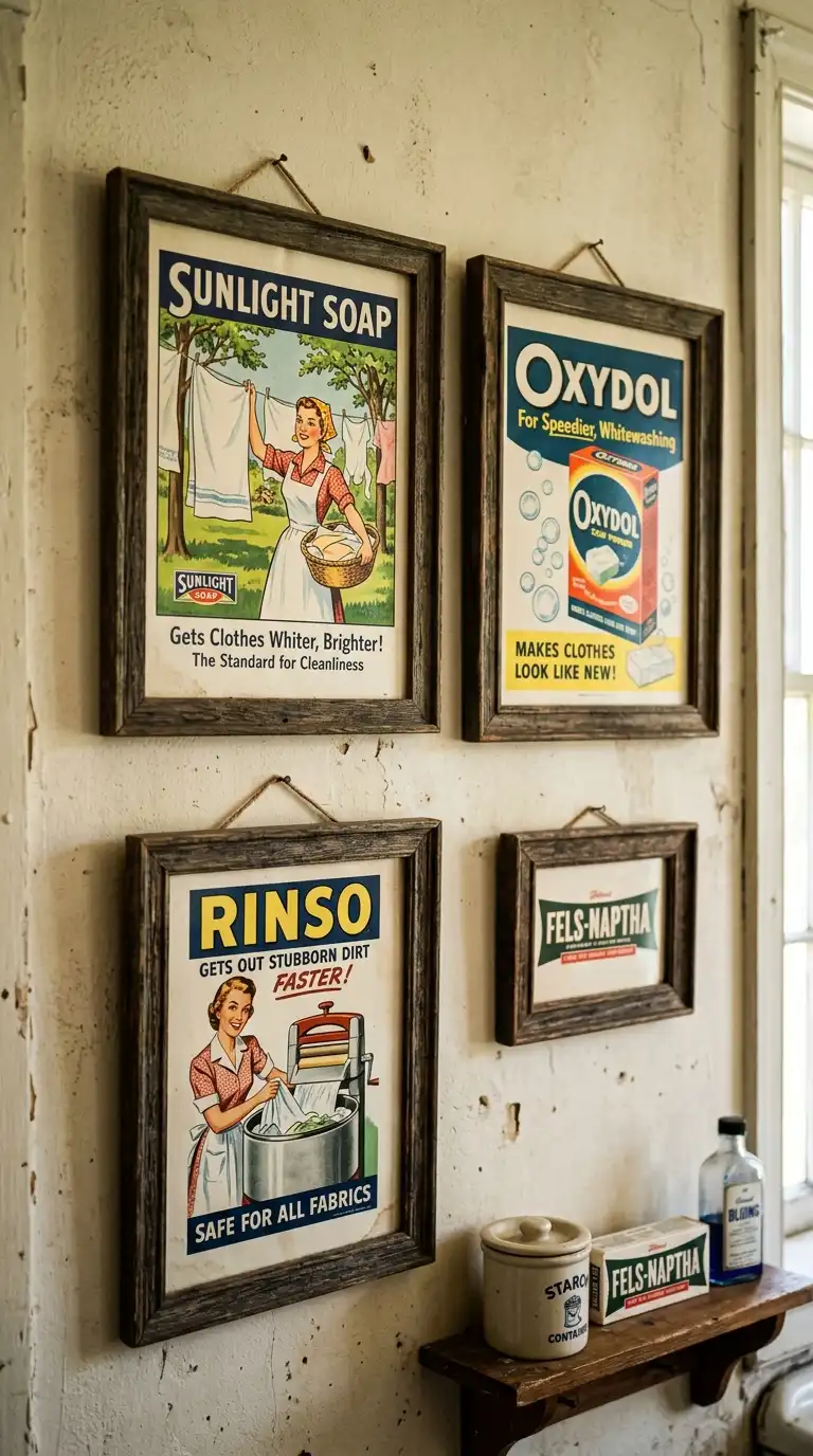 Frame vintage laundry advertisements or posters and hang them on the walls. Look for prints featuring old-fashioned washing machines, soap ads, or laundry tips from the 1920s-1950s. The artwork adds color, history, and personality.