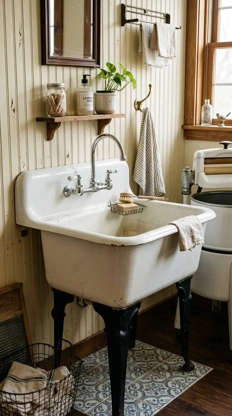 A vintage-style utility sink made of enamel or porcelain adds old-world charm. Look for a deep basin sink with a bridge faucet and exposed plumbing. The glossy white surface contrasts beautifully with darker cabinets or floors. Use the sink for hand-washing delicates and soaking stained clothes.