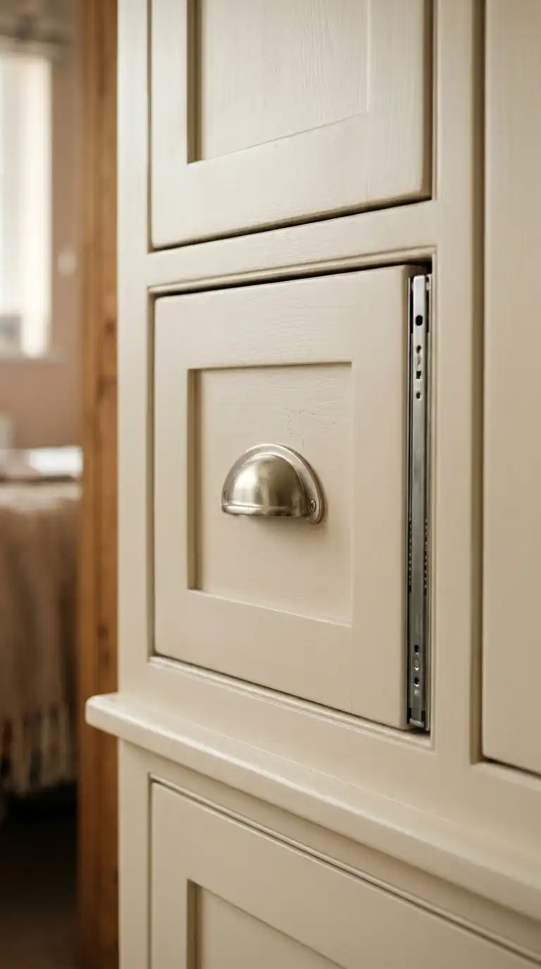 Image Prompt: A full view of a wardrobe with mixed handle styles—brass bar pulls on the large doors and ceramic knobs on the drawers. The combination adds personality and visual interest, creating a curated, custom look.
