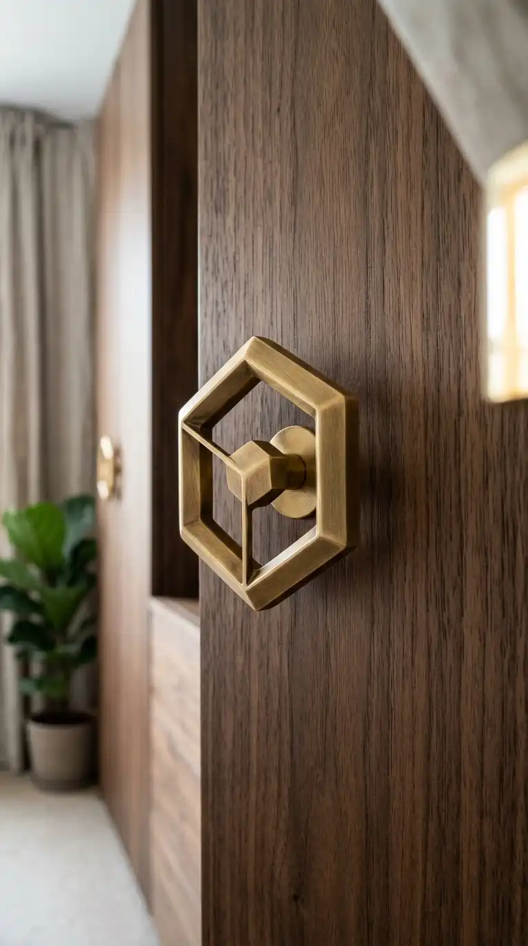 Geometric handles add a sculptural element to wardrobe doors. Shapes like hexagons, triangles, or circles create visual interest and become a design feature themselves. Choose finishes like brass, black, or chrome to complement your overall palette. Geometric handles are perfect for modern and eclectic interiors.