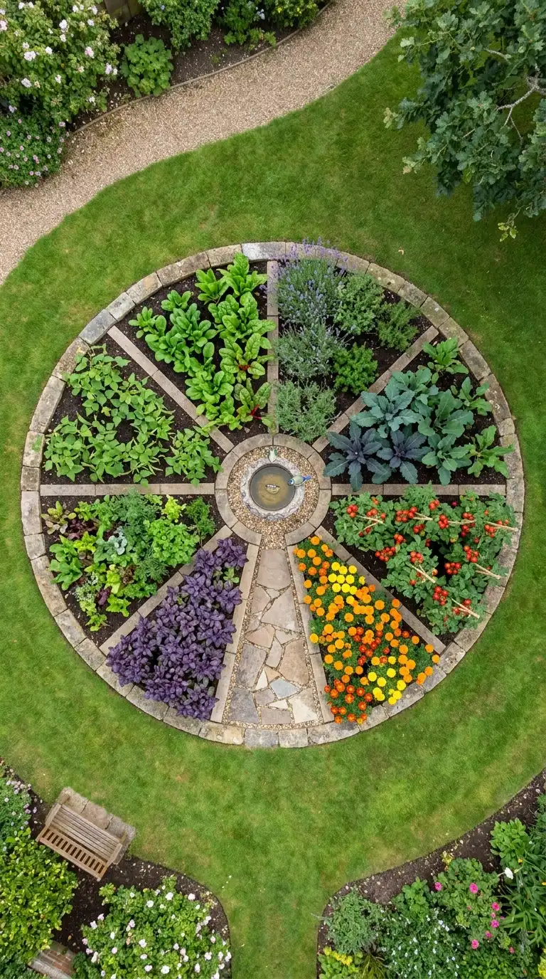 A single large circular bed (12-foot diameter) with a wedge-shaped “keyhole” cutout that allows access to the center. From above, it looks like a flower. This layout reduces wasted path space and looks stunning. Great for intensive planting.
