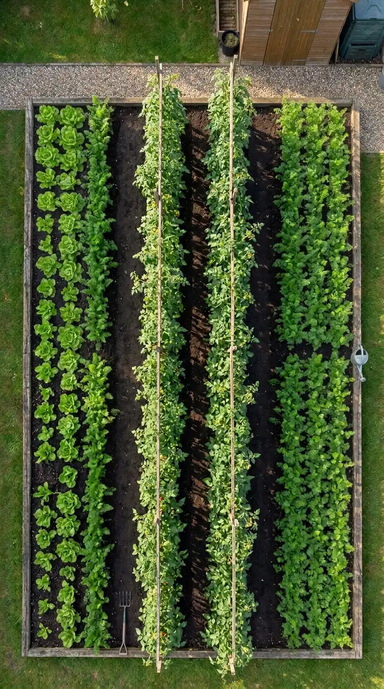 Long, straight rows running north to south. This ensures that tall plants (corn, tomatoes) don’t shade shorter ones (lettuce, radishes). Rows are 3 feet apart. A simple, old-fashioned layout that works for large vegetable gardens.