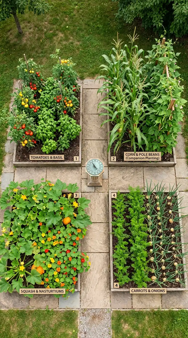 A square bed divided into four equal quadrants. Each quadrant pairs compatible plants: tomatoes with basil, carrots with onions, corn with beans, squash with nasturtiums. A small stone path forms a plus sign through the center.