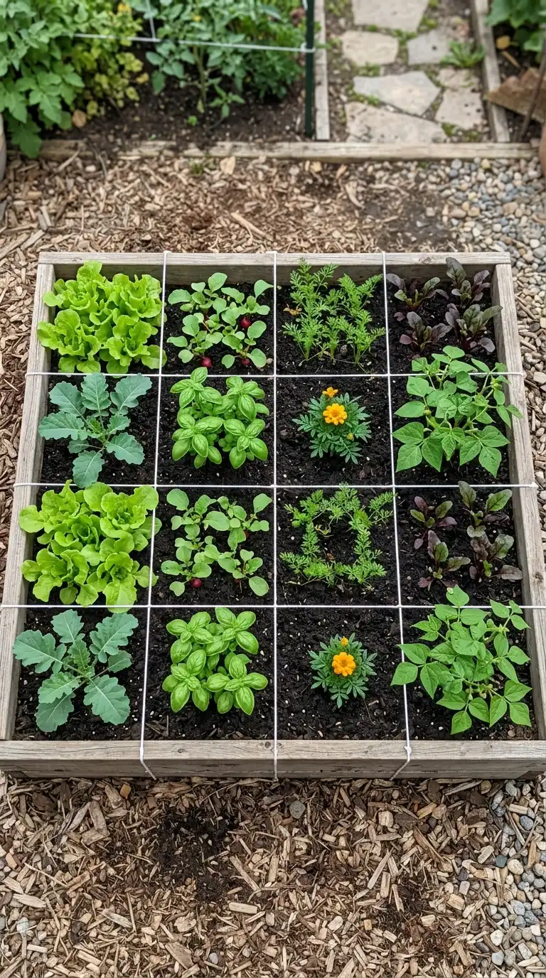 A single 4×4 foot raised bed divided into 16 one-foot squares by a physical grid (string or wooden slats). Each square holds a different crop: one square of radishes, one of carrots, one of kale, etc. Maximum production in minimum space.