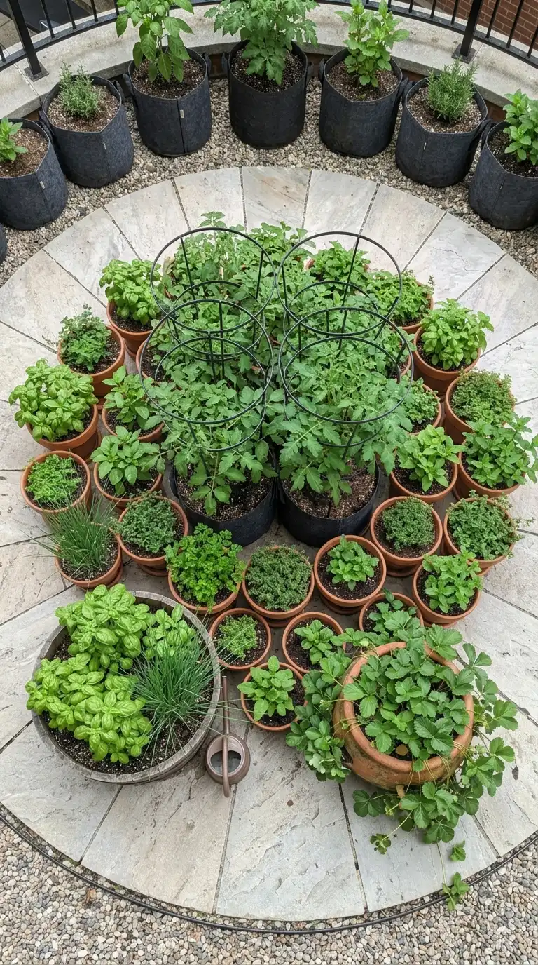No in-ground beds at all. A clustered arrangement of pots, grow bags, and planters on a patio or gravel pad. Group tall plants (tomatoes, peppers) in the back or center, trailing plants (strawberries, nasturtiums) at the edges. Entirely portable.