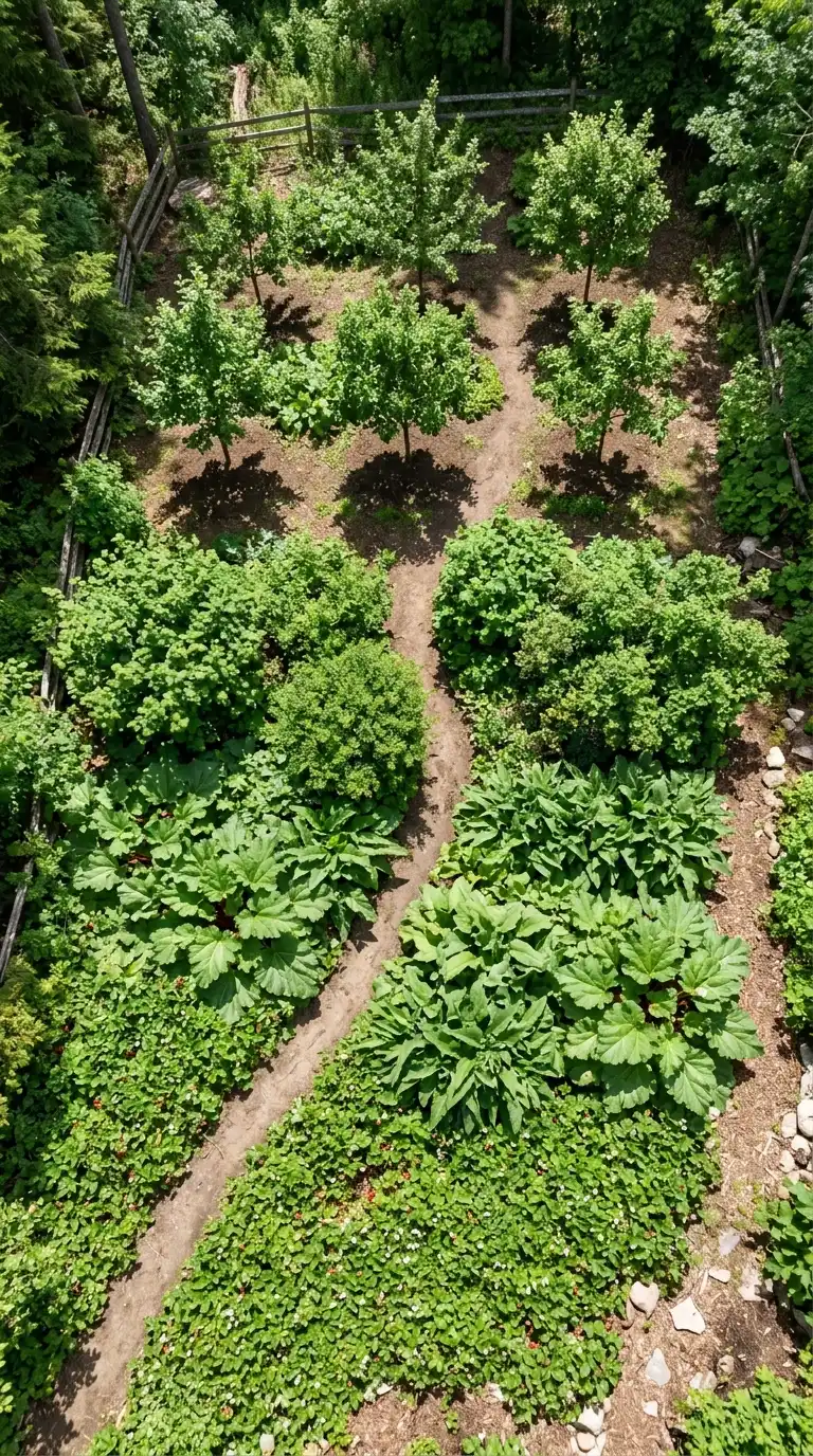 Mimics a natural woodland edge. Tall canopy trees (pawpaw, serviceberry) on the north side. Shrubs (currants, hazelnut) in the middle. Herbaceous plants (rhubarb, comfrey) below. Ground covers (wild ginger, strawberries) at the base. A path winds through all layers.
